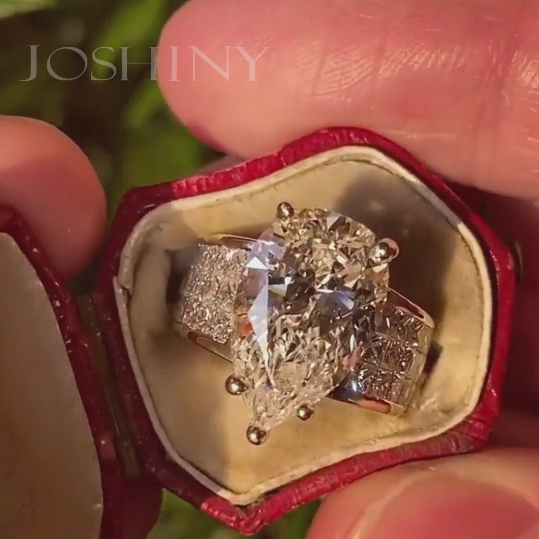 This is a wide shank ring with a 10ct pear cut stone in the center and 36 side stones on either side of the ring. The ring is made from 925 silver with a thicker layer of gold plating, which gives it a longer lasting shine than other single layer gold plating and gives it a personalized and luxurious look. This ring is perfect for adding personality to your style.