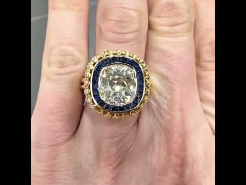 An antique ring made in 1953, the main stone is a 7 ct stone surrounded by a circle of blue stones, and the outermost circle is surrounded by gold "petals" set with single-cut stones.