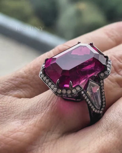 This ruby ring features a dazzling center stone, an emerald cut that exudes vintage glamour. It's surrounded by tiny round and shield-cut gemstones, their brilliance interwoven. The dark band adds a touch of mystery and nobility. Wearing it will instantly make your finger the center of attention, showcasing your unique charm.