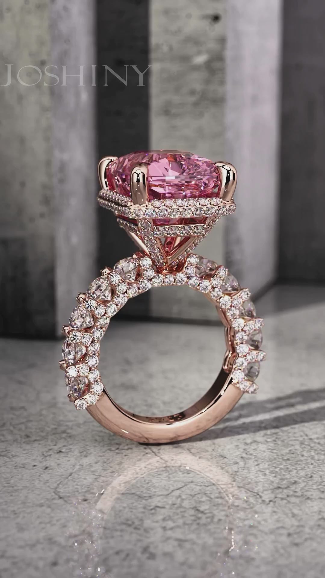 A lovely shade of cherry blossom pink to fulfil all women's girly dreams, set with a beautiful radiant cut main stone with a total stone weight of 10ctw.