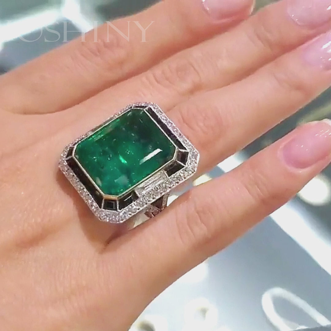 This is a vintage and personalized 10ctw emerald ring. Emerald cut main stone with black and white gemstones halo,mysterious and charming. The ring is made of 925 silver throughout, with thick gold plating, which makes the luster last longer compared to other single layer plating. Bringing more possibilities for your fashion collocation.