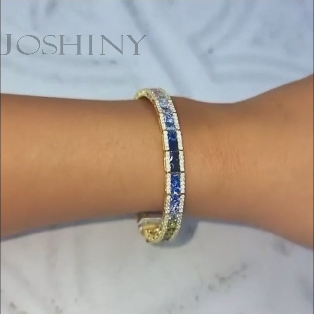 This is a tennis bracelet with 12.6 carats of princess and round cut multi-colored sapphires. The bracelet is made of 925 silver and comes in silver and gold with thick gold plating for a longer lasting shine than other single layer gold plating. It is sleek and beautifully simple, bringing more possibilities to your fashion ensemble.