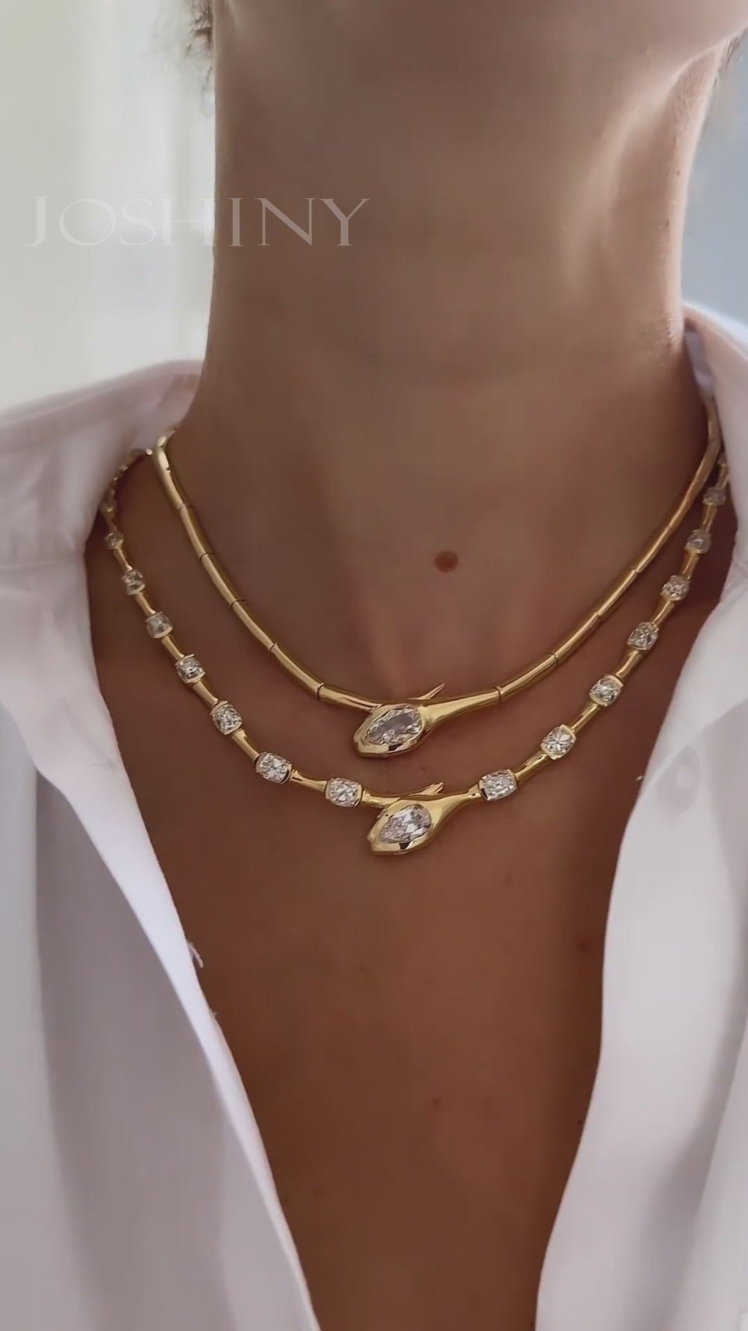 Our diamond snake collars have been so well received. This gold plated necklace features an antique pear shaped diamond as the head feature, the piece is set with 15.84 ctw of antique old mine diamonds and a 1.65 ct antique slender pear shaped diamond, modelling the links to the curvature of the neck. Providing the perfect serpentine streamlined silhouette for everyday wear.
