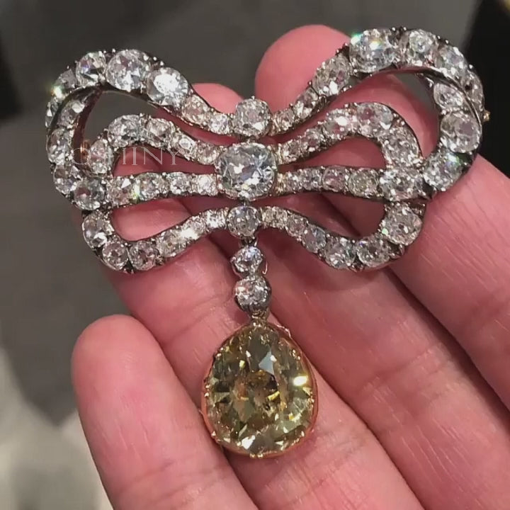 This brooch features a bow design with old mine-cut and single-cut gemstones, and the main stone is a teardrop-shaped yellow gemstone.