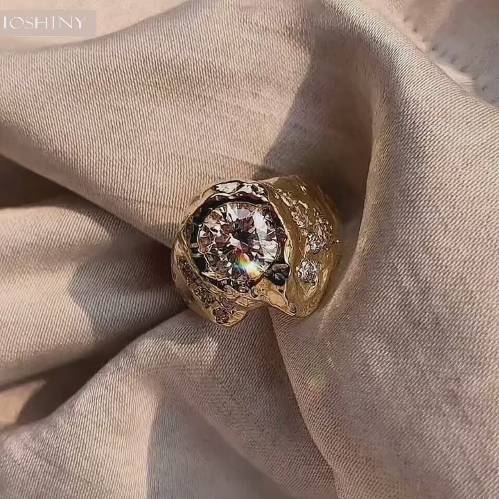 This ring is a sculpting of time and a testament to love. Its irregular design, like your uniqueness, shines with dazzling brilliance. The deep blue of the main gemstone and the delicate movement of the smaller gems intertwine, whispering an eternal vow. Wear it, and let every moment become a treasured memory.
