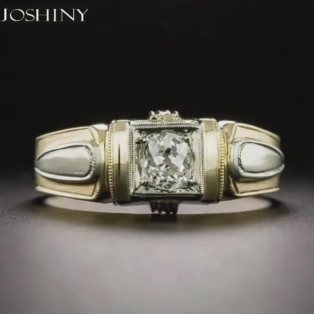 This Art Deco two-tone ring features an antique mine-cut gemstone, exuding vintage elegance. The combination of yellow and white gold showcases unique taste and is a symbol of timeless classicism, suitable for collection or as a family heirloom.
