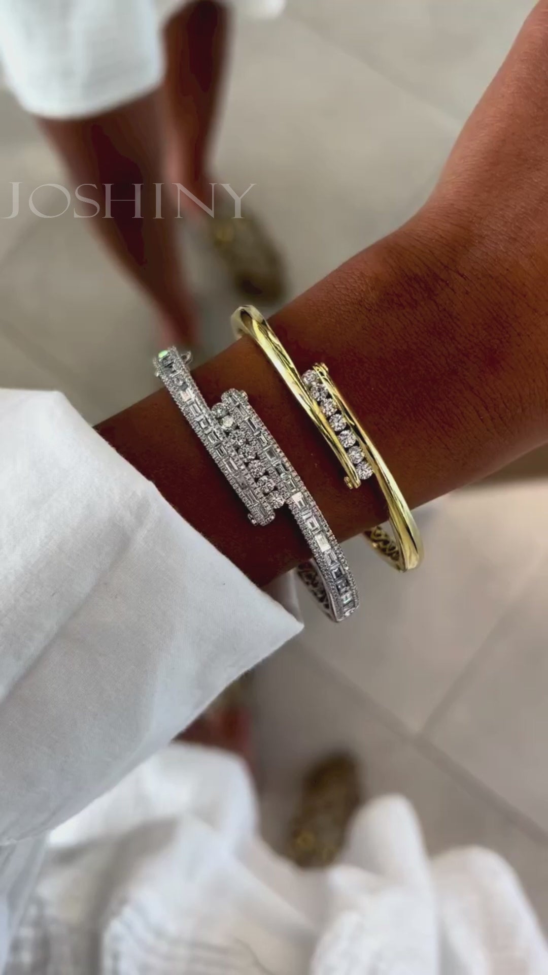 This bracelet, with its intertwining lines set with seven diamonds totaling 2.0ct, encircles happiness and all the favorites of the owner in this life. The bracelet is made of 925 silver with thick gold plating, which makes the luster of the bracelet more durable compared to other single-layer plating. The style is personalized and simple, bringing more possibilities for your fashion collocation.