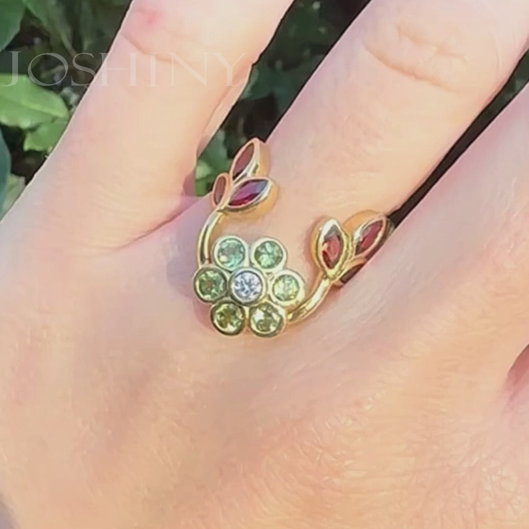 The petals of this flower, made of peridot, surround a gemstone of approximately 0.10 ct, while garnet leaves run up the finger. It is very luxurious on the finger.