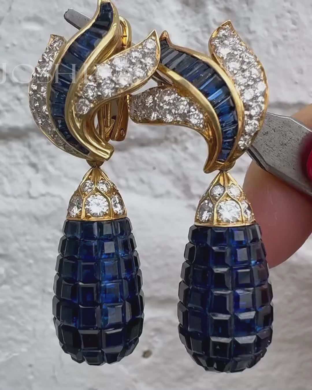 These gorgeous day and night dangle earrings feature flame shaped tops set with baguette sapphires and sparkling pavé stones. The additional 3D teardrop shaped pendant is a rare piece of craftsmanship. The earrings are crafted to perfection and are enhanced by the top blue gemstones and sparkling white stones!