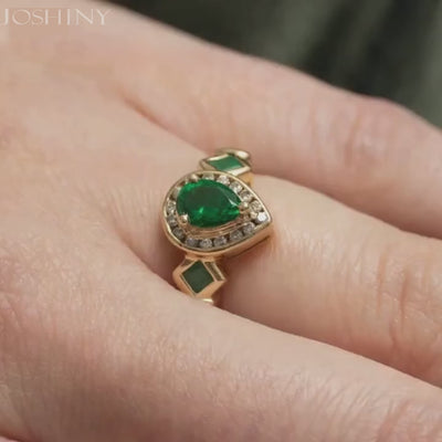This exquisite emerald and diamond cocktail ring features a pear-shaped emerald center stone surrounded by dazzling gemstones. The unique band design includes square emeralds on either side. Wearing it exudes a noble and elegant aura, making you the center of attention.