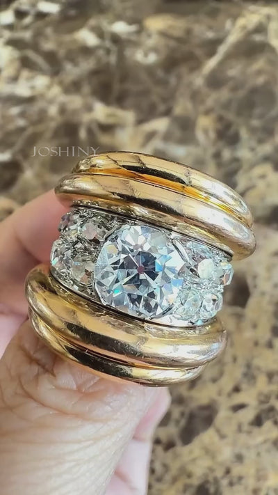 This vintage ring cleverly "sandwiches" a 2.6-carat French Old Mine Cut gemstone—the progenitor of the modern cushion brilliant cut—between two thick gold rings, creating the perfect stacked effect we've always dreamed of.