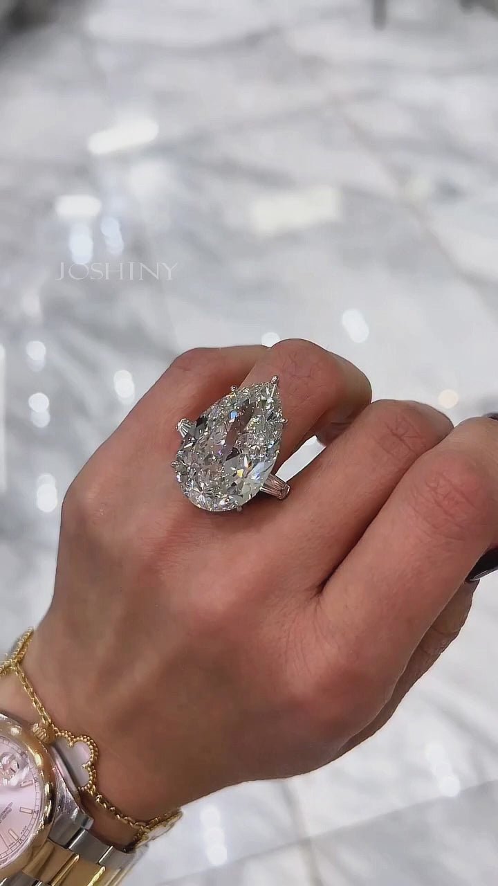 ✨ A 20.0-carat pear-shaped gemstone ring, set with tapered and rectangular side stones.