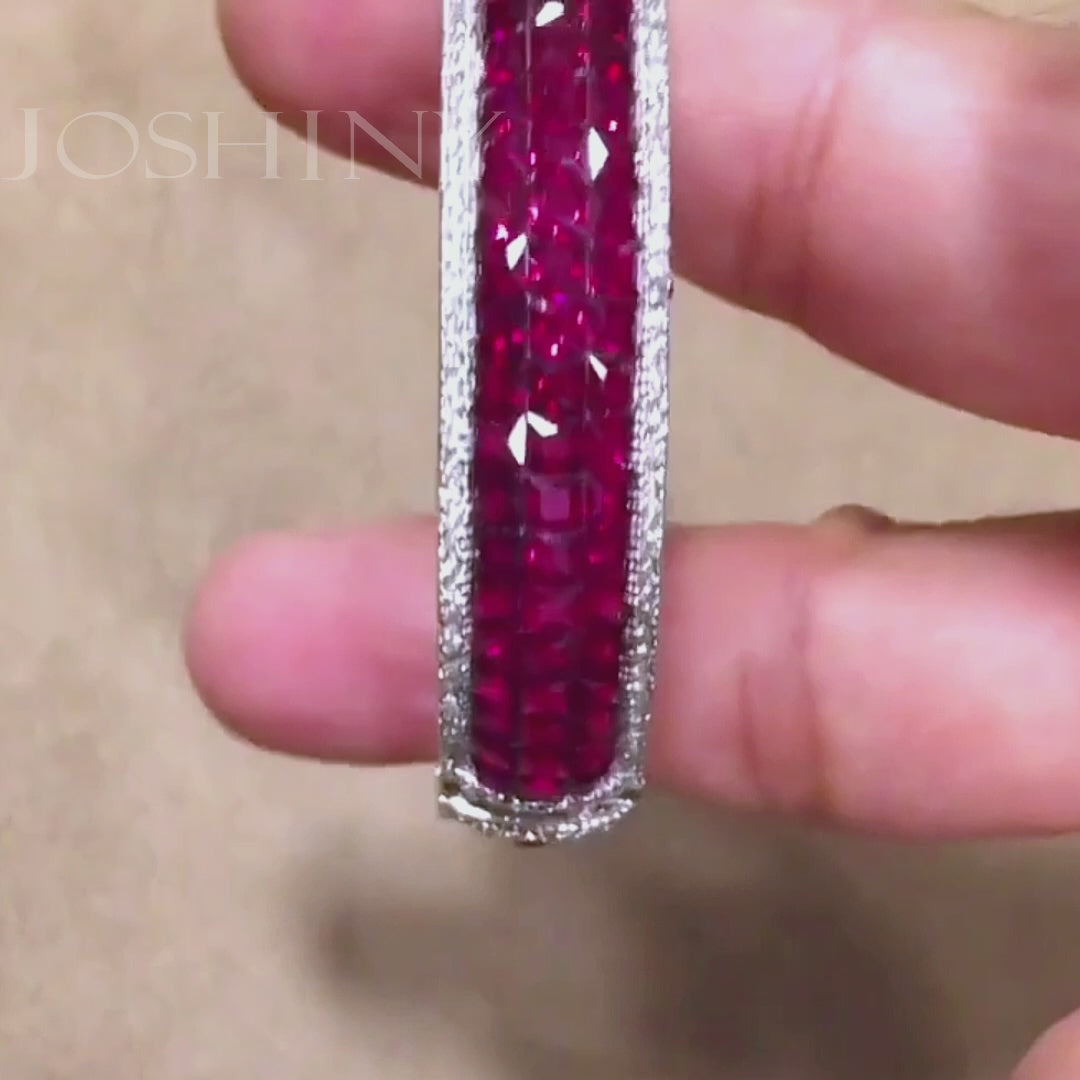 This is a full hoop, 22.4ctw, invisible setting bracelet,vintage, elegant. The princess cut Ruby very exquisite. The bracelet is made of 925 silver throughout, with thick gold plating, which makes the luster more durable compared to other single layer plating. Bring more possibilities for your fashion collocation.