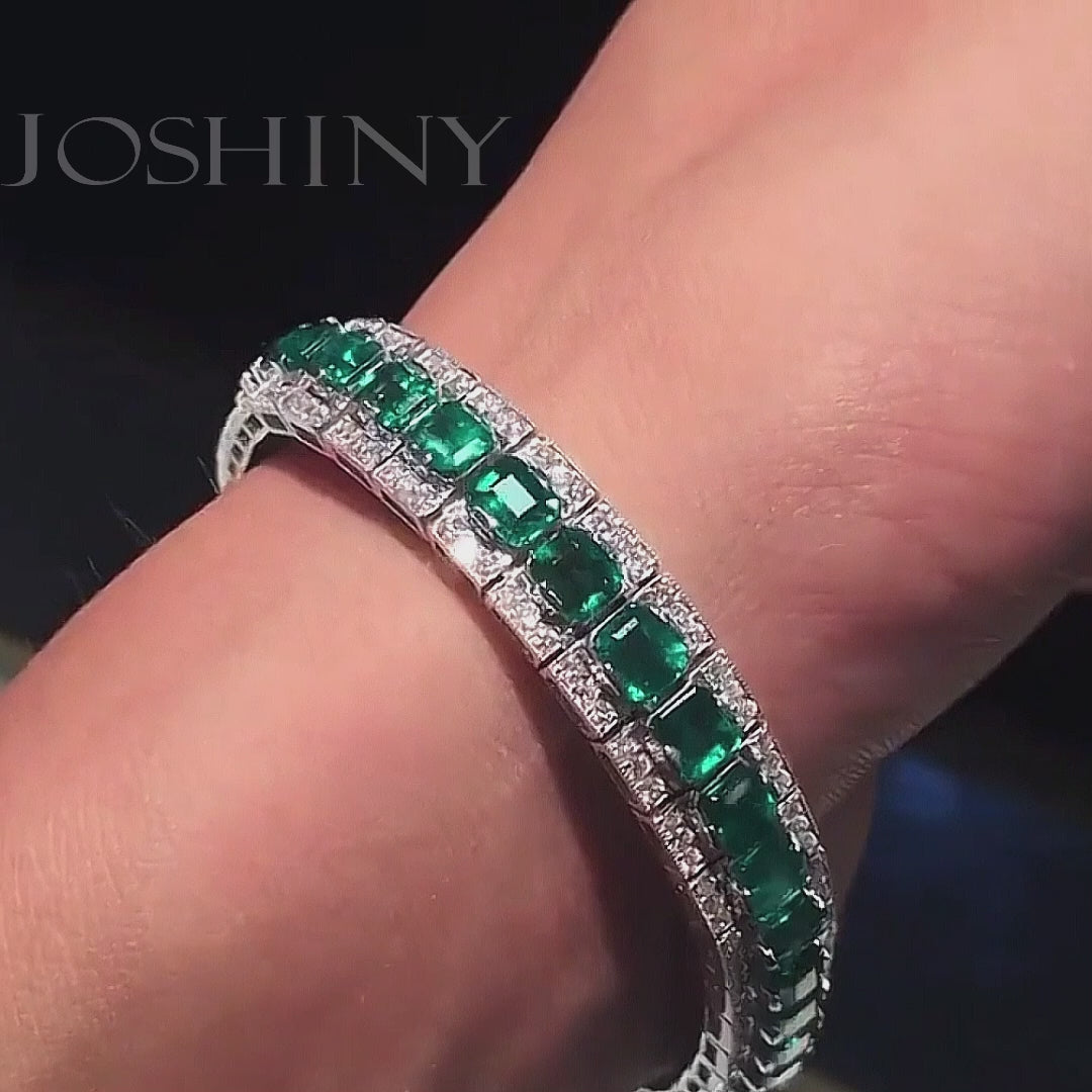 This is a two-tone bracelet made of cushion-shaped green and round white gemstones with a total carat weight of 23.55, with a row of cushion-cut emerald stones in the center section. The bracelet is made of 925 silver with a thick layer of gold plating for a longer lasting shine than other single layer gold plating. The style is personalized and simple, bringing more possibilities for your fashionable matching.