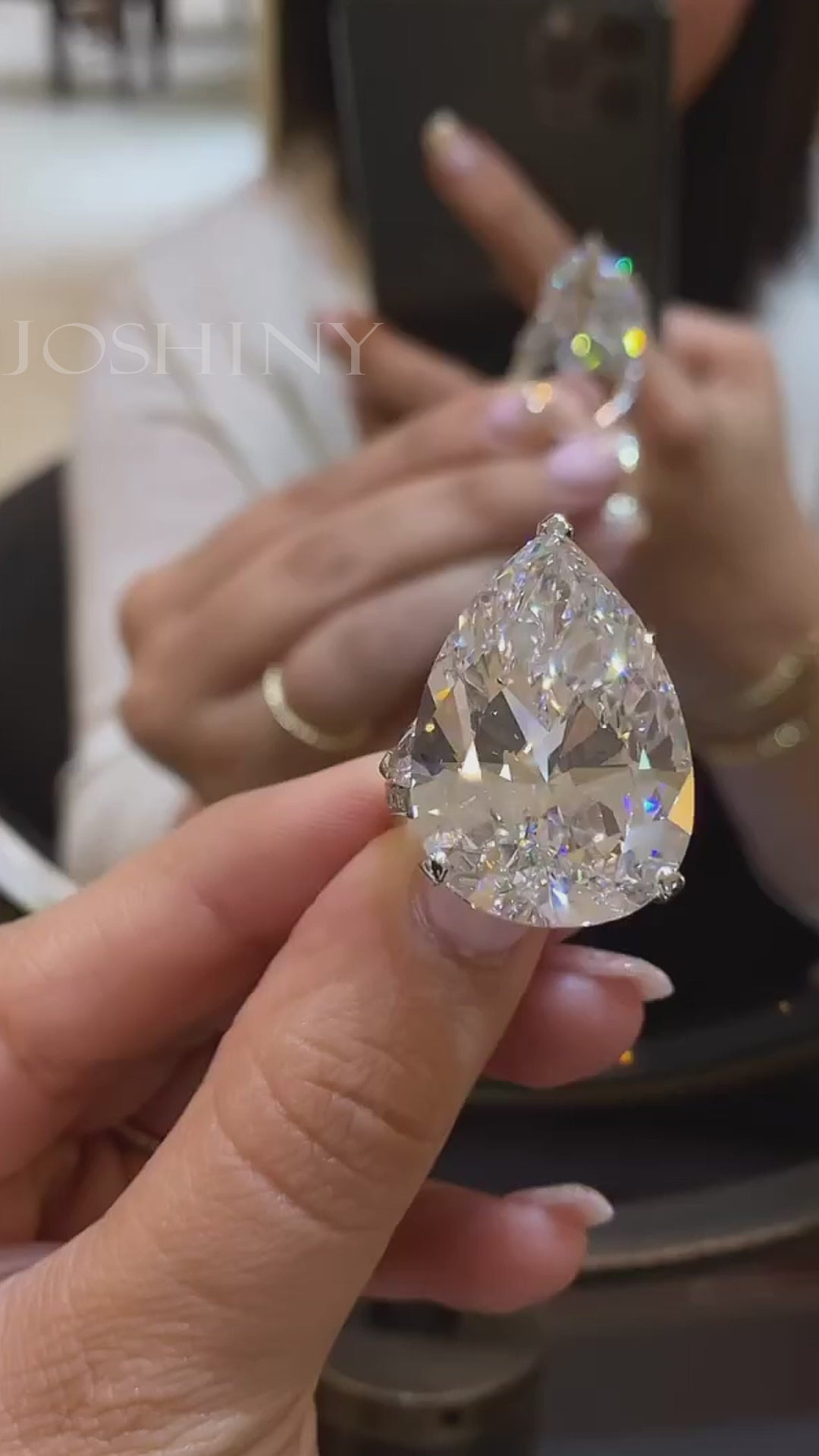 with this stellar and alluring 28ct D Flawless pear-shaped diamond set in a delicate sunken halo, diamond encrusted basket and band, flanked by pear-shaped diamonds…