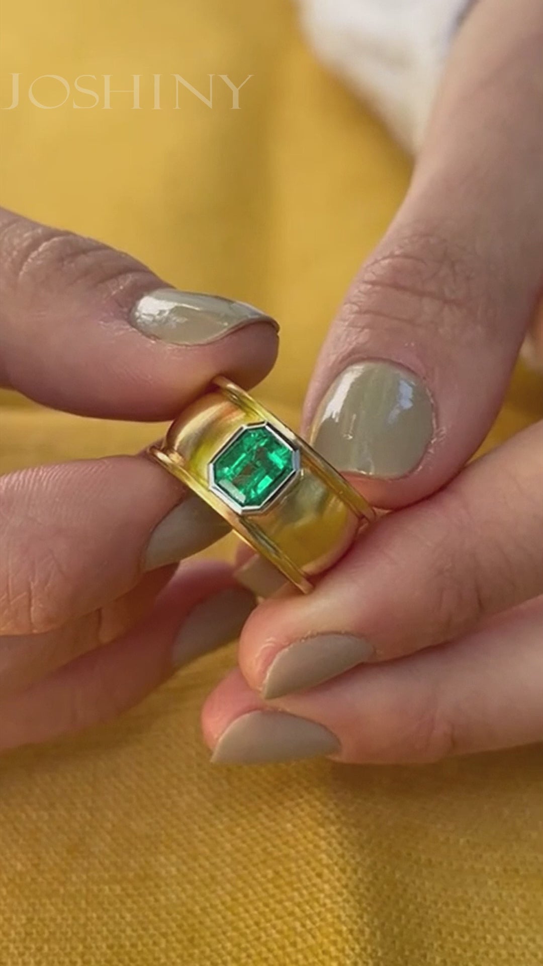 This is a minimalist design ring. 2ct emerald cut main stone with platinum colored bezel setting, feel simple but powerful,gold colored band is vintage and sleek. The collision of square and round makes this ring wearable for both women and men. The ring is made of 925 silver throughout, with thick gold plating, which makes the luster last longer compared to other single layer plating. The style is personalized and simple, bringing more possibilities for your fashion collocation.