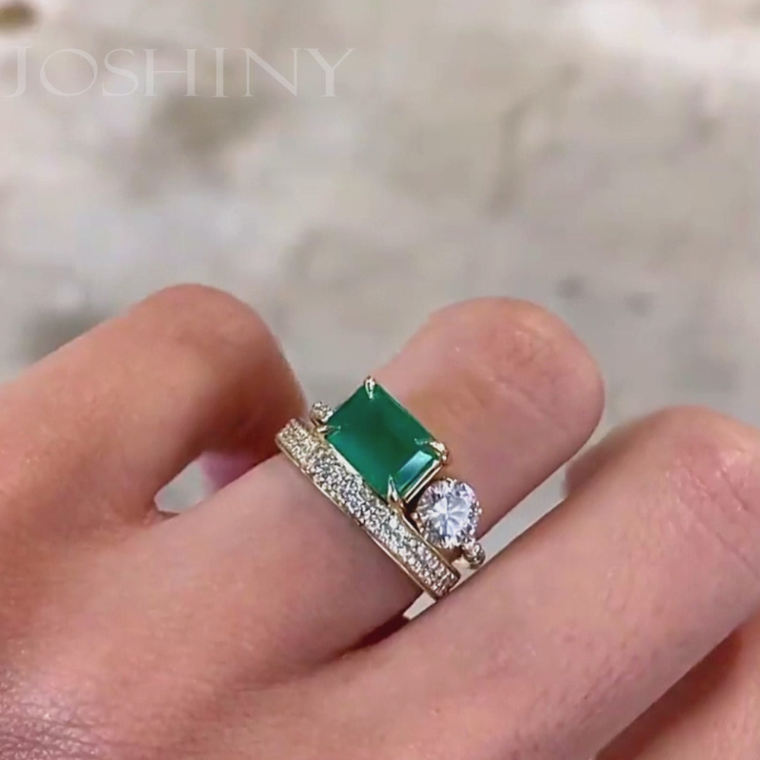 This is a matching set that can be purchased separately. Emerald main stone and pave set halo with personalized design. The other opening ring is simple and unique, wear it alone or in a combination, both stunning! Â The ring is made of 925 silver throughout, with thick gold plating, which makes the luster last longer compared to other single layer plating. The style is personalized and simple, bringing more possibilities for your fashion collocation.