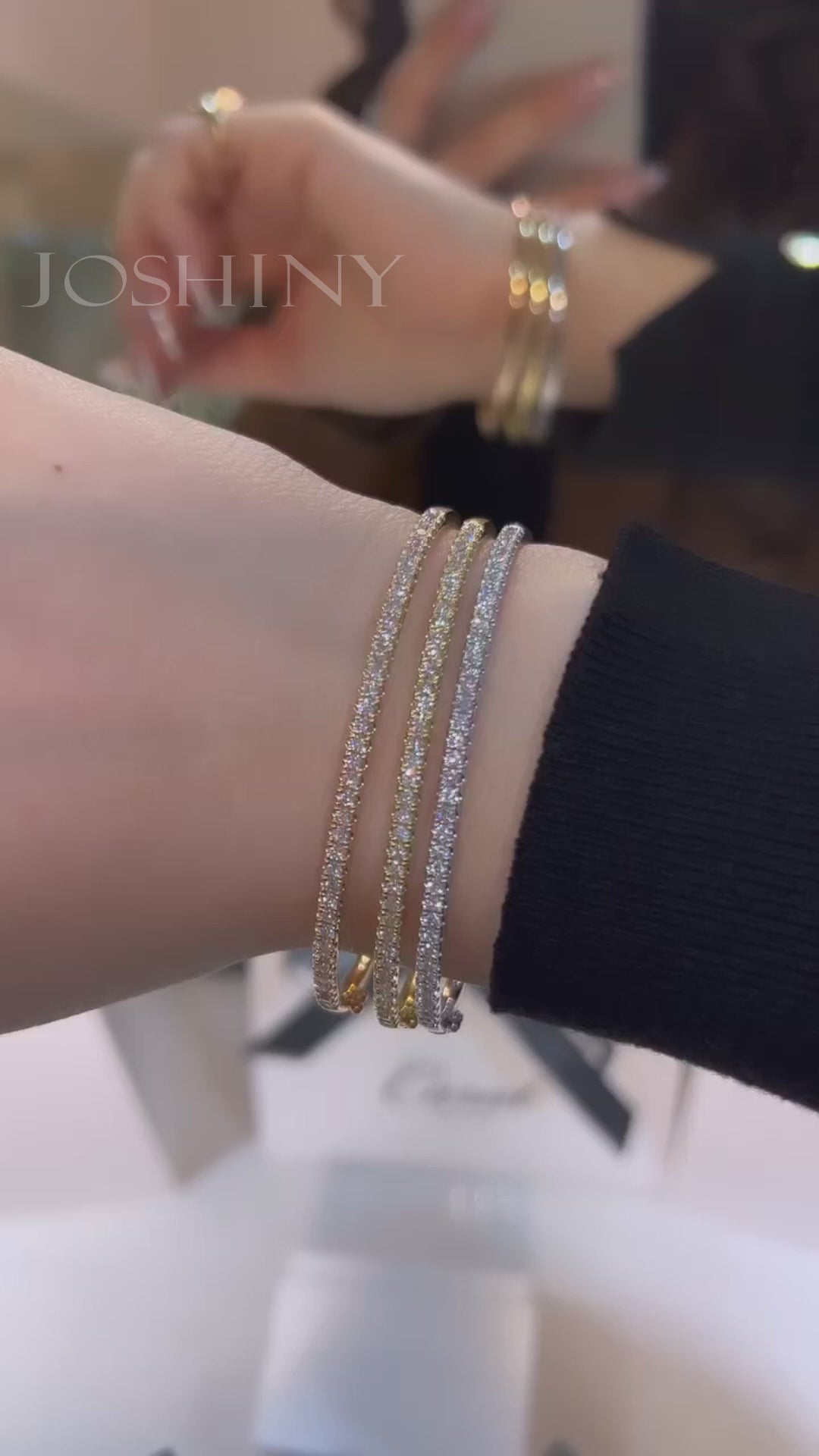 This is a classically designed bracelet. 2ctw single row of round cut stones, simple and graceful. We have three plating colors for your choice. The ring is made of 925 silver throughout and plated with thick gold, which makes the luster more lasting compared to other single layer plating. Bring more possibilities for your fashion collocation.