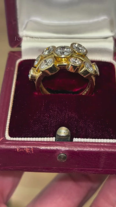 This exquisite gold gemstone "bubble" ring features a unique staggered setting design, with multiple round brilliant-cut gemstones sparkling brilliantly on the finger.
