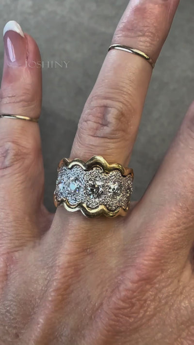 This wide, wave-shaped ring, set with dazzling gemstones, features a unique and exquisite wave design. The combination of gold and gemstones exudes luxury and elegance. Wearing it will effortlessly elevate your style and make you the center of attention. Its simple and sophisticated design is suitable for various occasions.