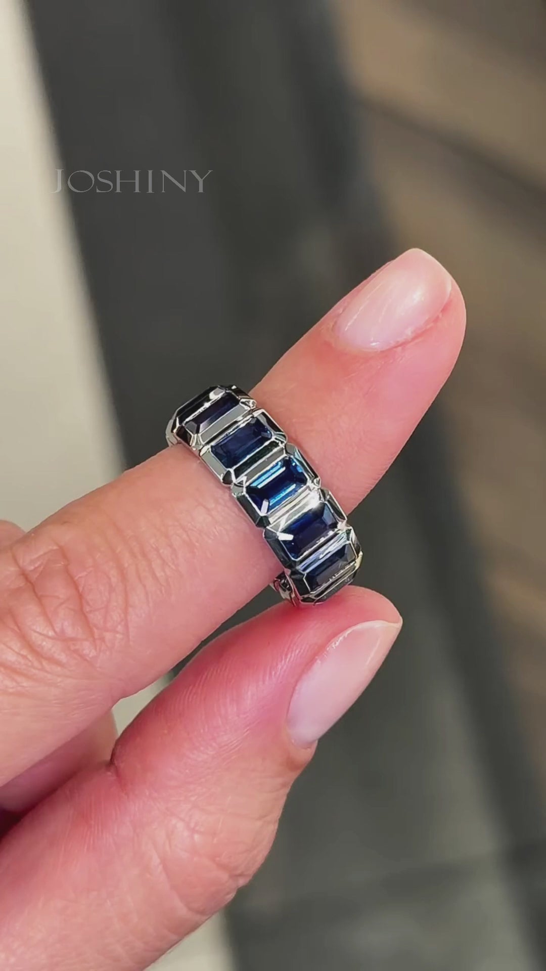 Sparkling on your finger, this sapphire and emerald-cut timeless ring uses a deep blue hue to accentuate the gemstone's brilliance. Its simple yet elegant design symbolizes unchanging love and commitment, making it the perfect choice to brighten up your everyday look.