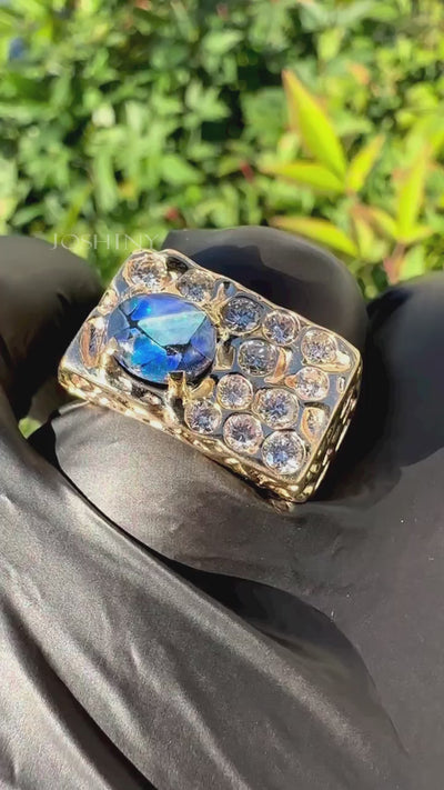 A deep blue opal set with sparkling gemstones in a gold band exudes luxury and mystery. This extraordinary ring on your finger showcases exceptional taste and personal charm, making you the center of attention.