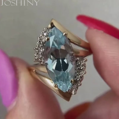 This is a striking ring. It features a marquise-cut aquamarine as the center stone, surrounded by round-cut diamonds. The aquamarine, with its captivating light blue hue, is held prominently to showcase its beauty. The ring is crafted with gold-plated metal, ensuring a luxurious and long-lasting shine. Its unique and glamorous style makes it a standout piece, bringing a touch of elegance and individuality to your fashion ensemble.
