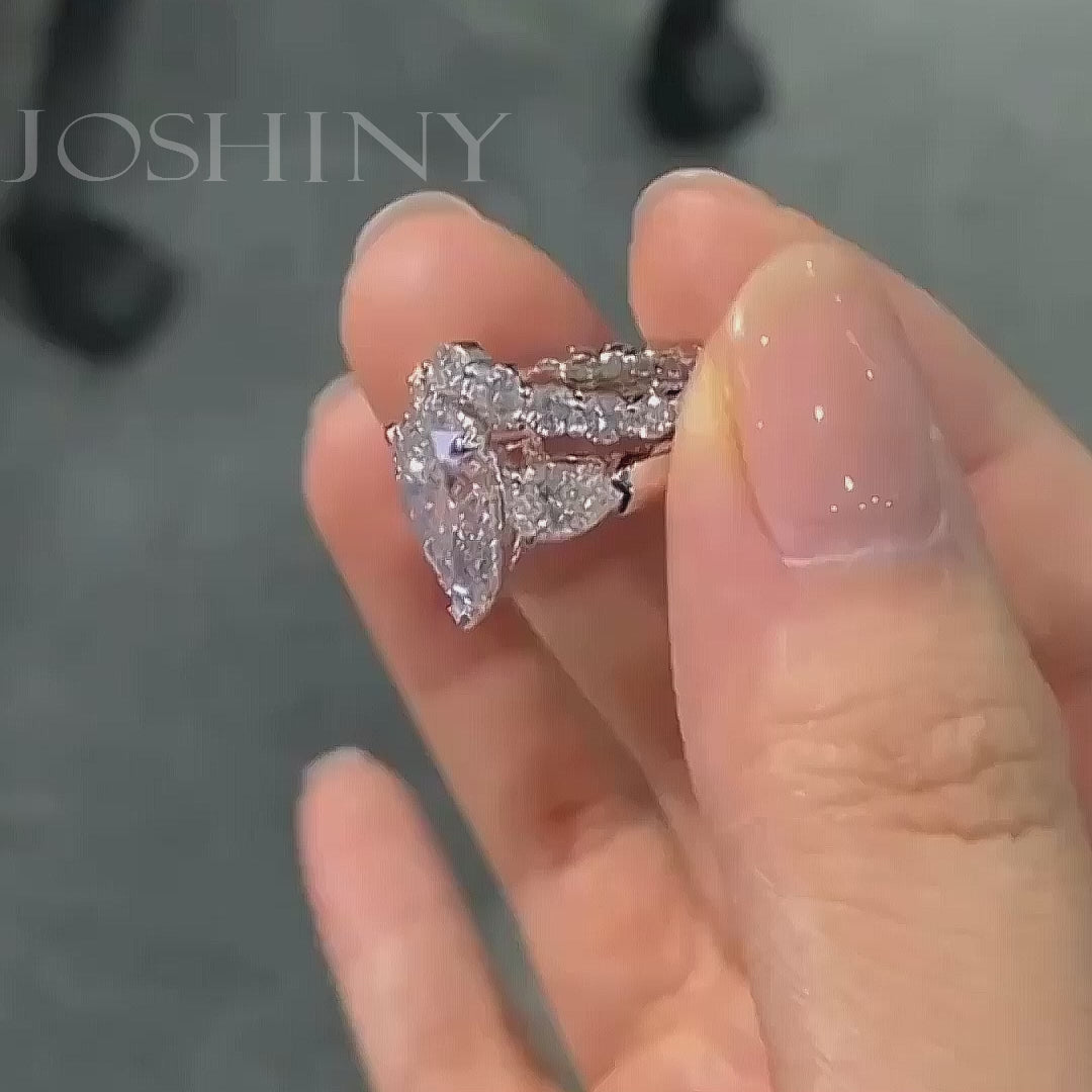 The two rings in one is a striking design, with a 3.5ct pear cut main stone in the center of the main ring. On either side are two pear-cut white secondary stones totaling 1.0ct. The main ring is paired with a round cut sub ring in a V shape. Two rings in one, one ring for multiple wearers. The ring is made of 925 silver with a thicker layer of gold plating for a longer lasting shine than other single layer gold plating. An elegant addition to your closet.