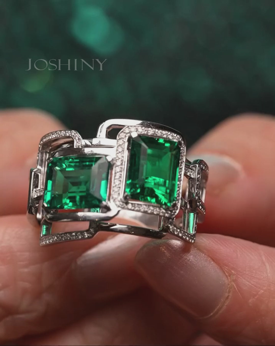 This exquisite ring features two rectangular emeralds surrounded by sparkling white gemstones, a unique design that exudes elegance and sophistication. Wearing it is like possessing an eternal spring, dazzling and captivating at first sight. It's an indispensable highlight on your fingertips, showcasing exceptional taste.