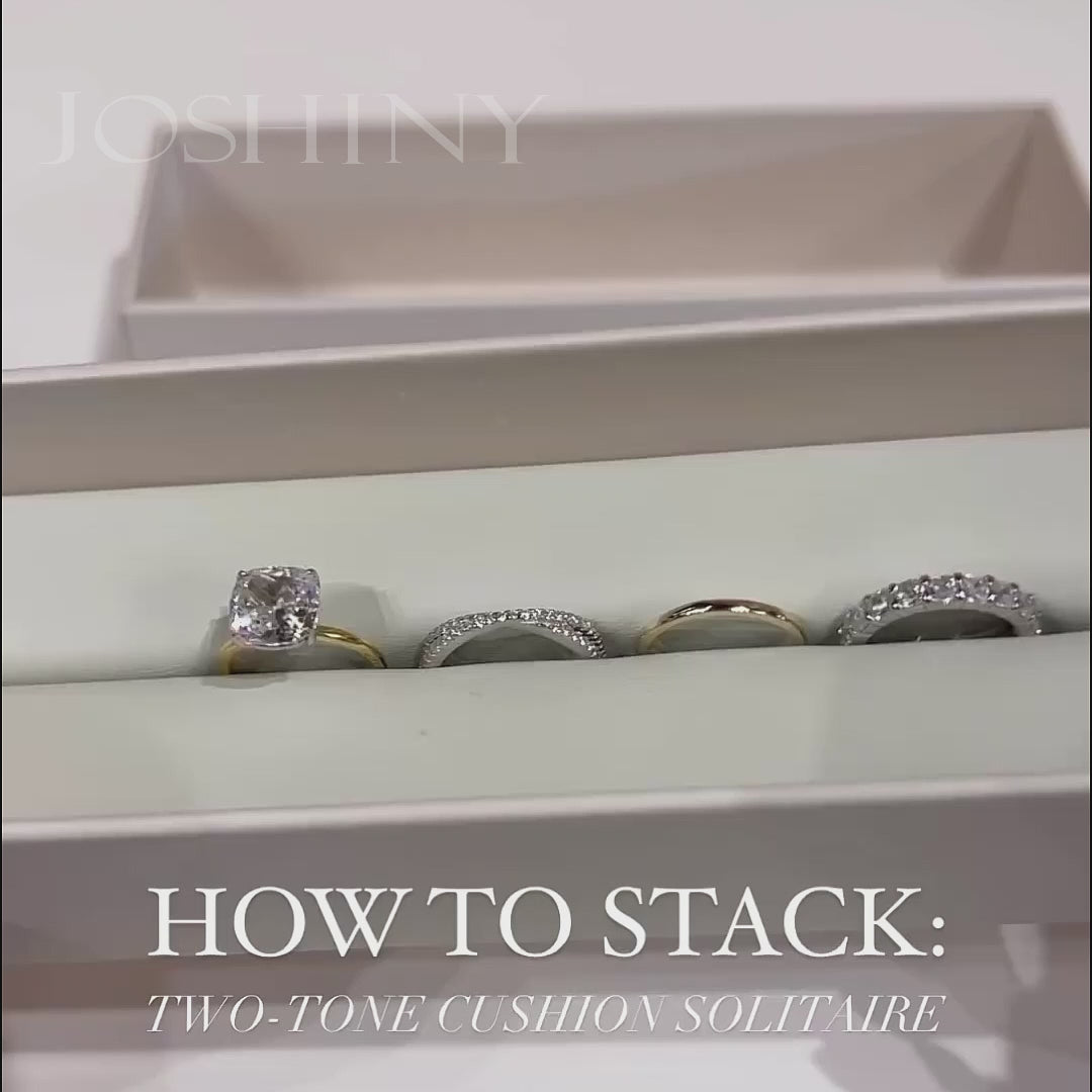 This is a classic 4-piece engagement ring set. 3.5 carat cushion cut gemstone main ring,simple and bright. Three fashionable sub-rings use in pave set and unilaid,can be worn individually. The ring is made of 925 silver throughout and plated with thick gold, which makes the luster more lasting compared to other single layer plating. Bring more possibilities for your fashion collocation.