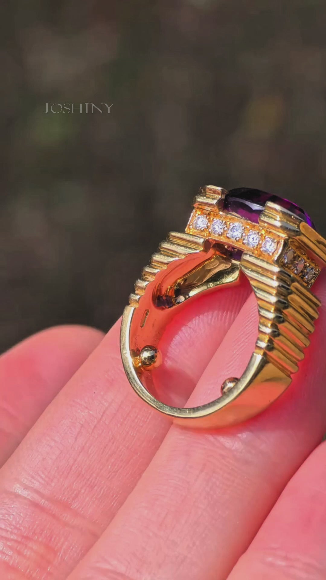 This exquisite gold ring, set with a deep purple gemstone, exudes unparalleled luxury and elegance. Its unique design and superb craftsmanship make it the center of attention on any occasion. Wear it to showcase your exceptional taste and capture every precious moment. Limited edition, don't miss out.