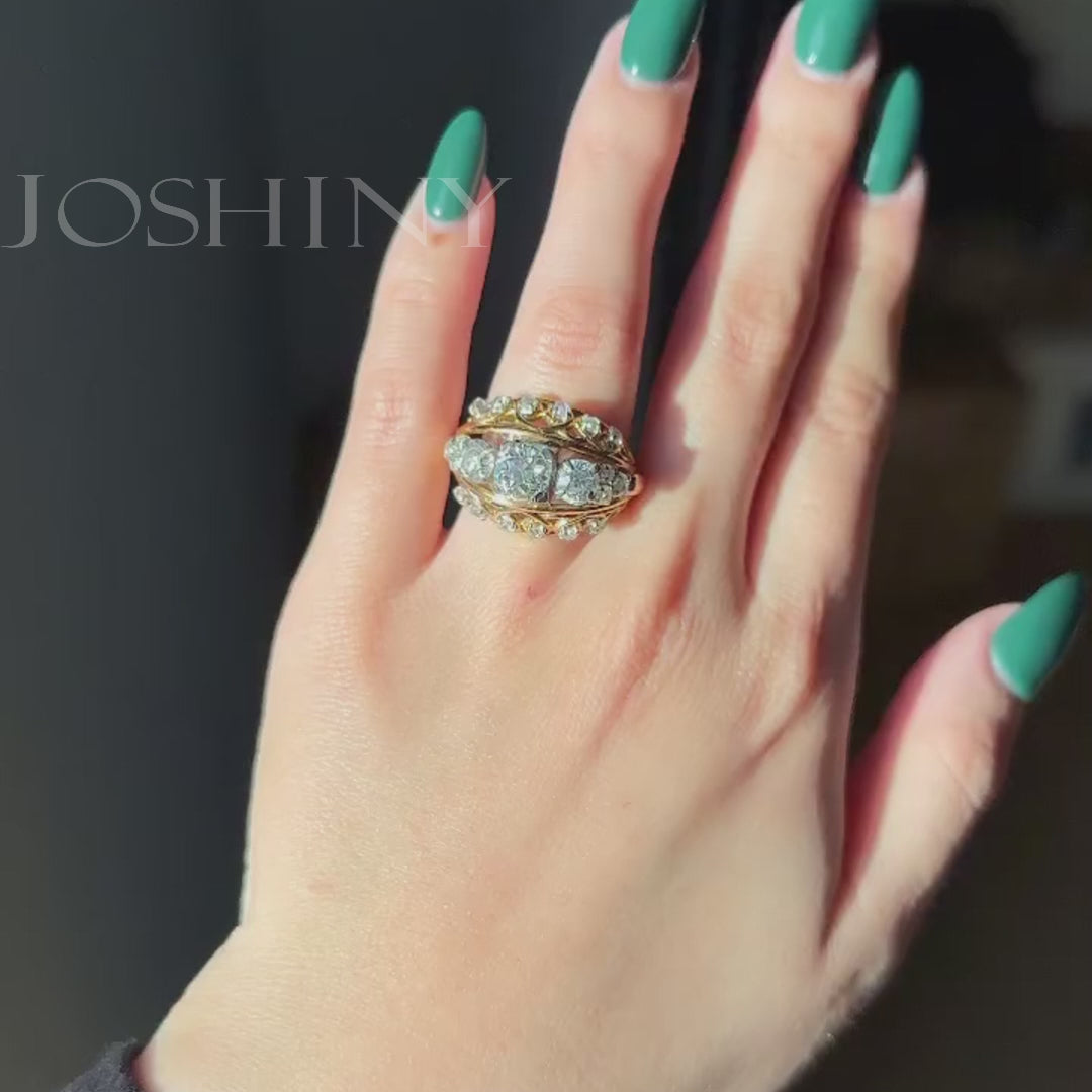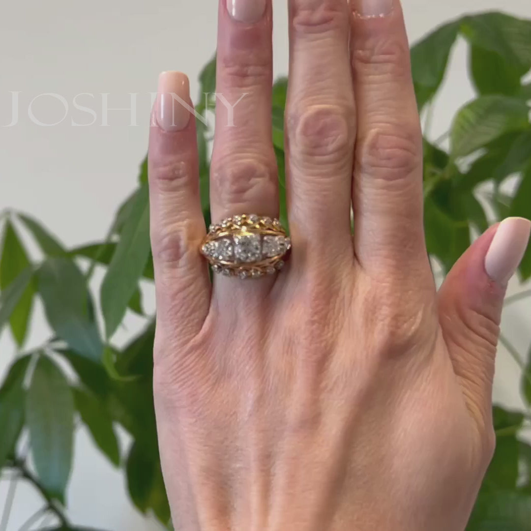 A vintage French diamond gold dome ring. Set with a round cut diamond weighing approximately 3ct, embellished with 20 round cut diamonds weighing a total of approximately 7ctw.These diamonds are superbly crafted in a gold openwork setting, giving off a warm inviting glow.The ring is made of 925 silver with thick gold plating, which gives it a longer lasting shine compared to other single layer plating. The style is personalized and artistic, bringing more possibilities for your fashion matching.