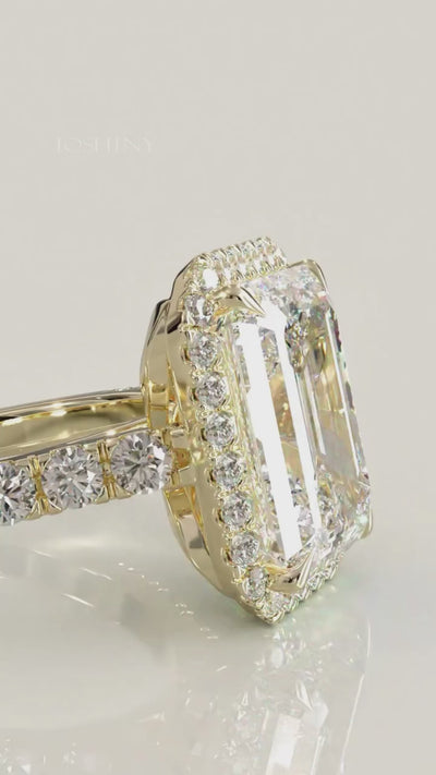 This emerald-cut engagement ring features a dazzling center stone surrounded by exquisite smaller gemstones, exuding elegance and luxury. The interplay of light and shadow creates a unique effect, while the gold setting adds a touch of vintage charm. It's a perfect promise of eternal love, the most dazzling sight on your fingertips.