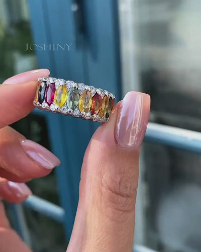 Sparkling with color, this rainbow sapphire ring gathers the seven hues of light. Adorned with dazzling gemstones, it exudes feminine elegance and unique charm. Wear it daily for a joyful experience. Unique beauty awaits you.