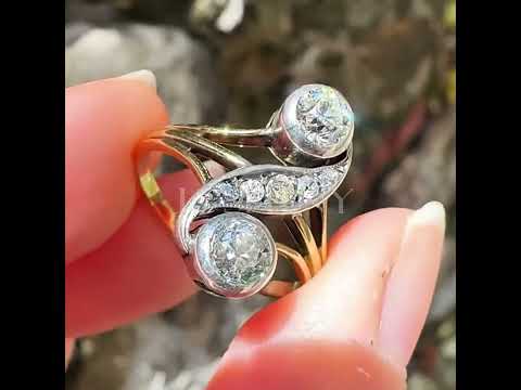 Beautifully crafted toi&moi style ring with 18kt yellow gold and silver top. Two larger old European cut stones weighing approximately 1.0ct each. Very clean and bright stones. Five additional old diamonds and single cut stones are set between the two main stones, creating a very fluid and lovely design.