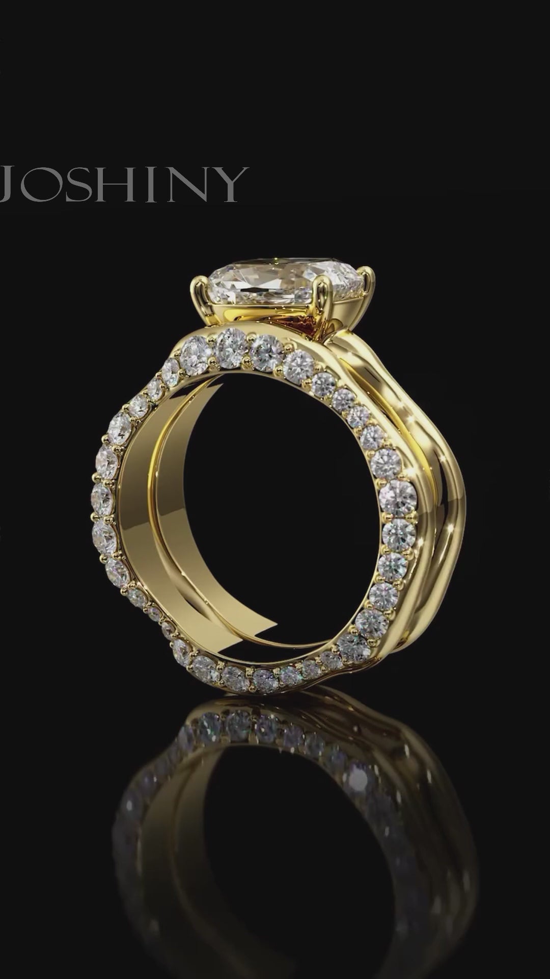 Interlocking gold rings with large cushion-cut gemstones set like the brightest stars in the night sky, this set of rings is a blend of luxury and romance that will make you sparkle.