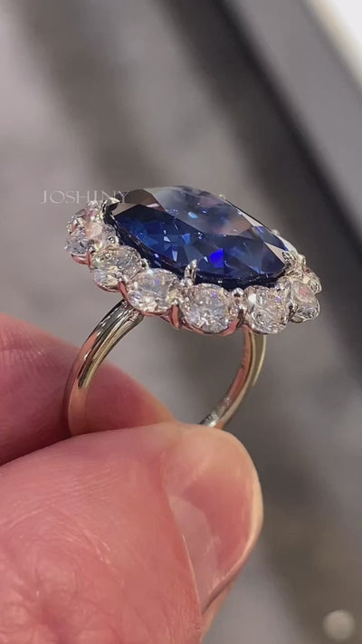 A classic royal blue sapphire ring, featuring a deep and captivating main stone surrounded by sparkling gemstones, exuding an air of nobility and elegance.