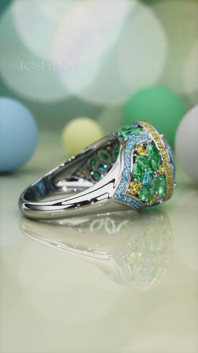 This exquisite and unique ring is set with dazzling light blue aquamarines, sparkling gemstones, and emeralds, seemingly encapsulating the tranquility of the ocean and the vitality of the forest on your fingertips. Wearing it exudes elegance and nobility, making you the center of attention. Capture the light and shadow, and let your unique charm shine.