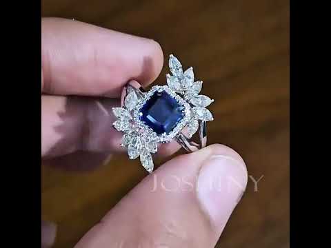 Stunning gemstone ring with 3ct square cut blue main stone, lab-grown. 1.15ct marquise cut, 0.11ct round gemstones.