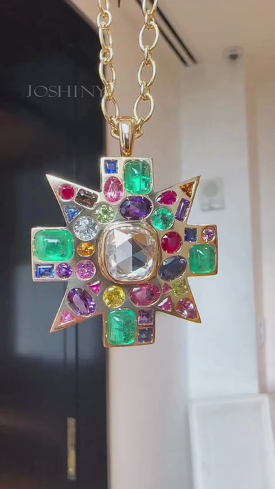 This gorgeous necklace is made of gold and set with gemstones of various colors, including emeralds, rubies, and sapphires. Its unique star-shaped design exudes Byzantine style and noble temperament, making it the perfect focal point to brighten up your look.