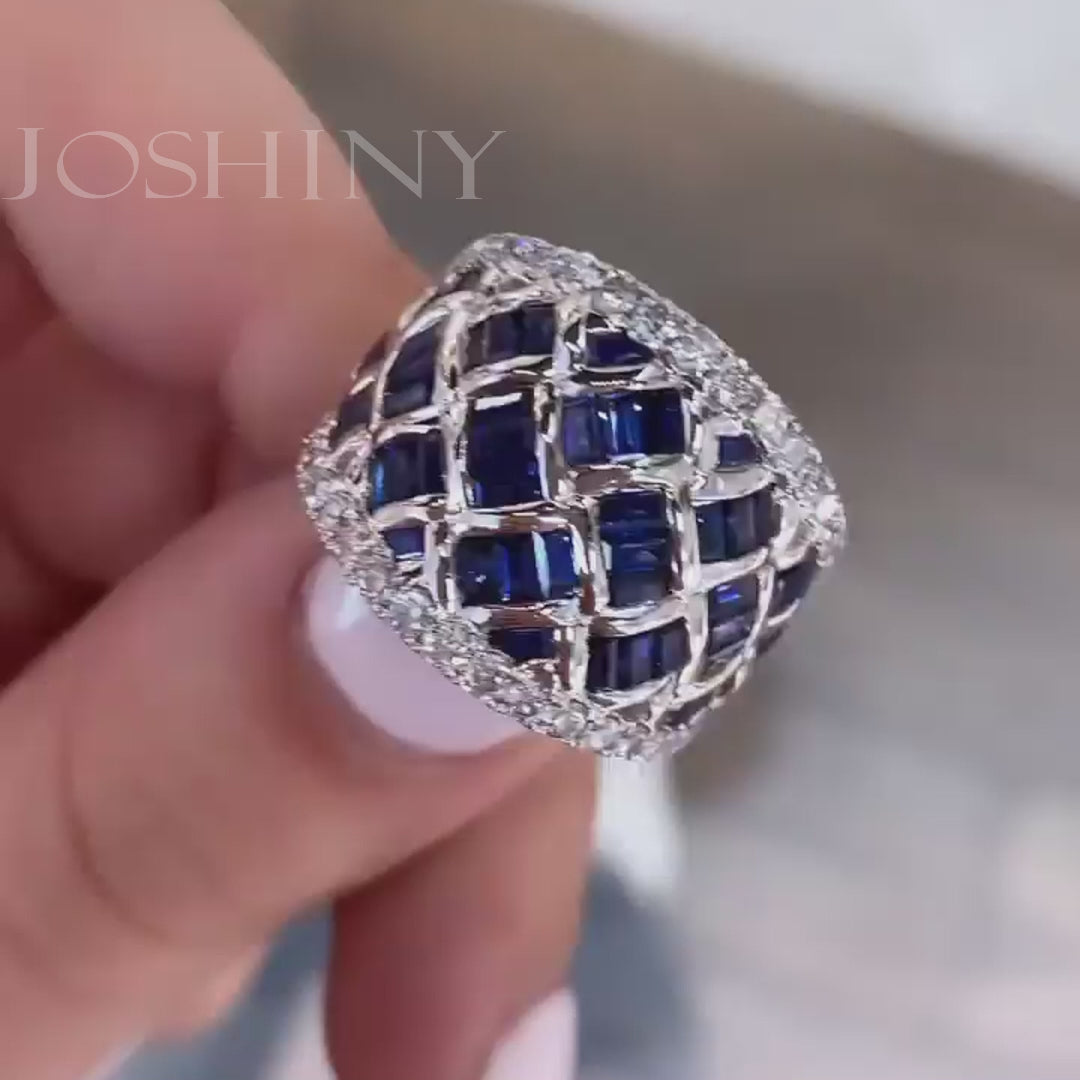 How wonderful is this incredible blue stone and diamond basket weave ring! The classic style blends perfectly with modern metals, stones and craftsmanship. The end result is a multi-faceted, three-dimensional piece that stands out from the crowd. The ring is set with baguette blue stones and round diamonds. The body of the ring is made of 925 silver with a thick gold-plated finish for a longer-lasting shine than other single-layer gold plating. The style is individual and elegant, bringing more possibilities to your fashion ensemble.