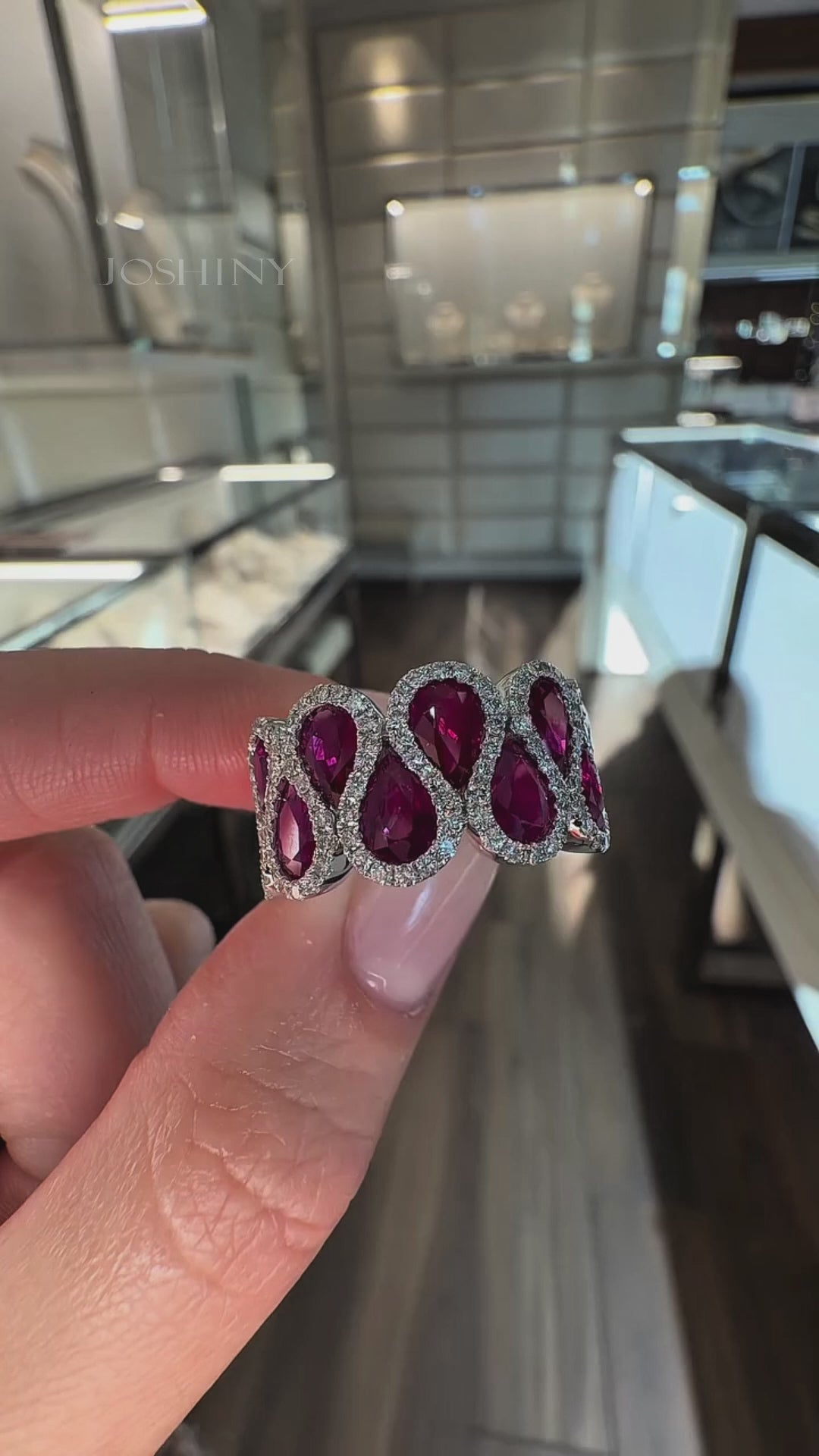 This exquisite ruby ring features a pear-cut ruby intertwined with brilliant side stones. The wavy shape is elegant and charming, adding a touch of luxury and romance to your fingertips. Wear it and become the center of attention.