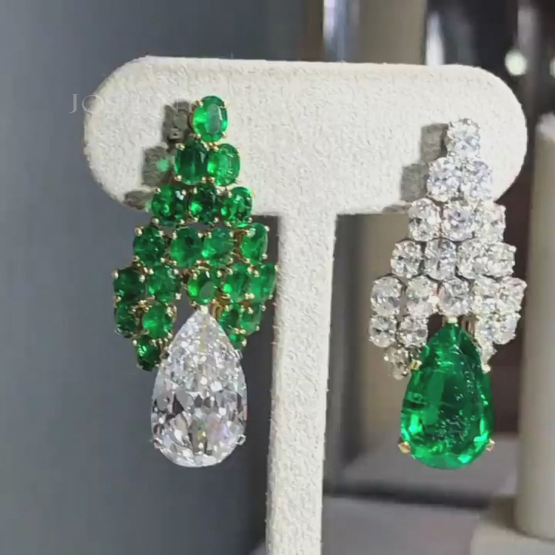 A stunning cascade of emeralds and dazzling white gemstones creates a breathtakingly beautiful earring. The interplay of light and shadow exudes elegance and sophistication, illuminating every precious moment – an experience not to be missed.