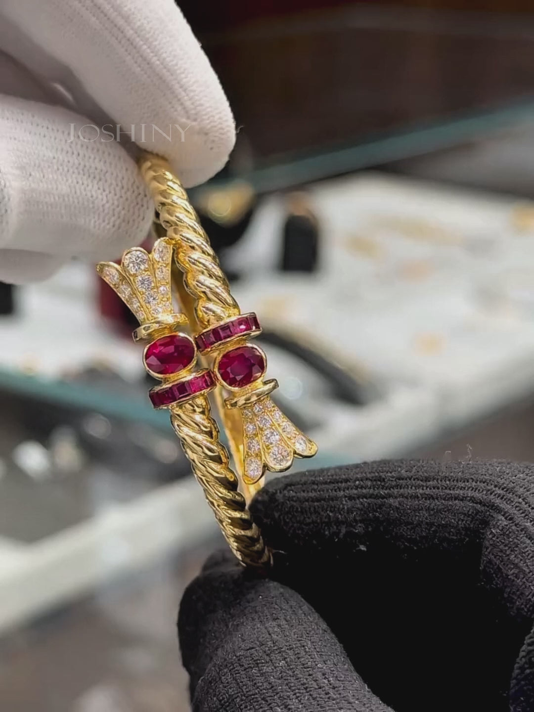 This beautiful bracelet combines luxury and elegance. The golden guilloche design is unique, the inlaid rubies are rich in color, and the gem embellishments add to the brilliance. Whether it is for daily wear or special occasions, it can show your extraordinary taste and is a treasure worth collecting.