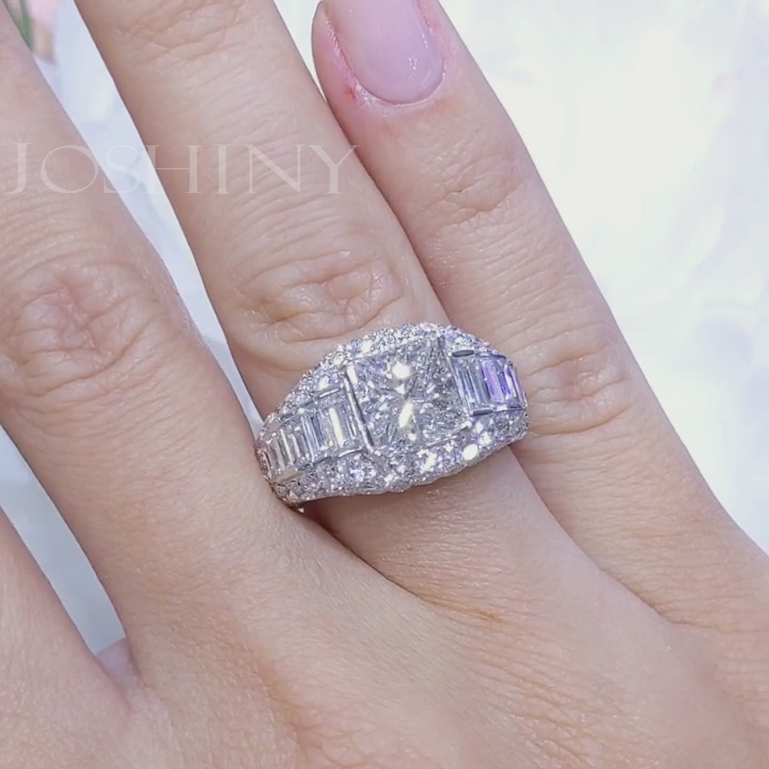 This chic engagement ring has an AGI certified clarity enhanced 2.22ct princess cut central diamond, set in Platinum setting with additional 3.10ct of baguette and round diamonds on the sides.The ring holder is made of 925 silver throughout and plated with thick gold, which makes the lustre more lasting compared to other single layer plating. The style is personalised and gorgeous, bringing more possibilities for your fashion matching.