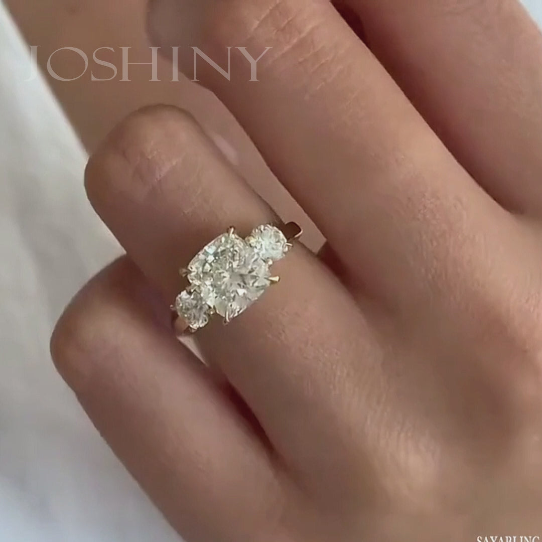 This is a three stone design ring with a 5.4ct cushion cut center stone and two side stones. The ring is made of 925 silver with thick gold plating, which gives it a longer lasting shine than other single layer gold plating. The style is simple and personalized, bringing more possibilities to your fashionable combination.