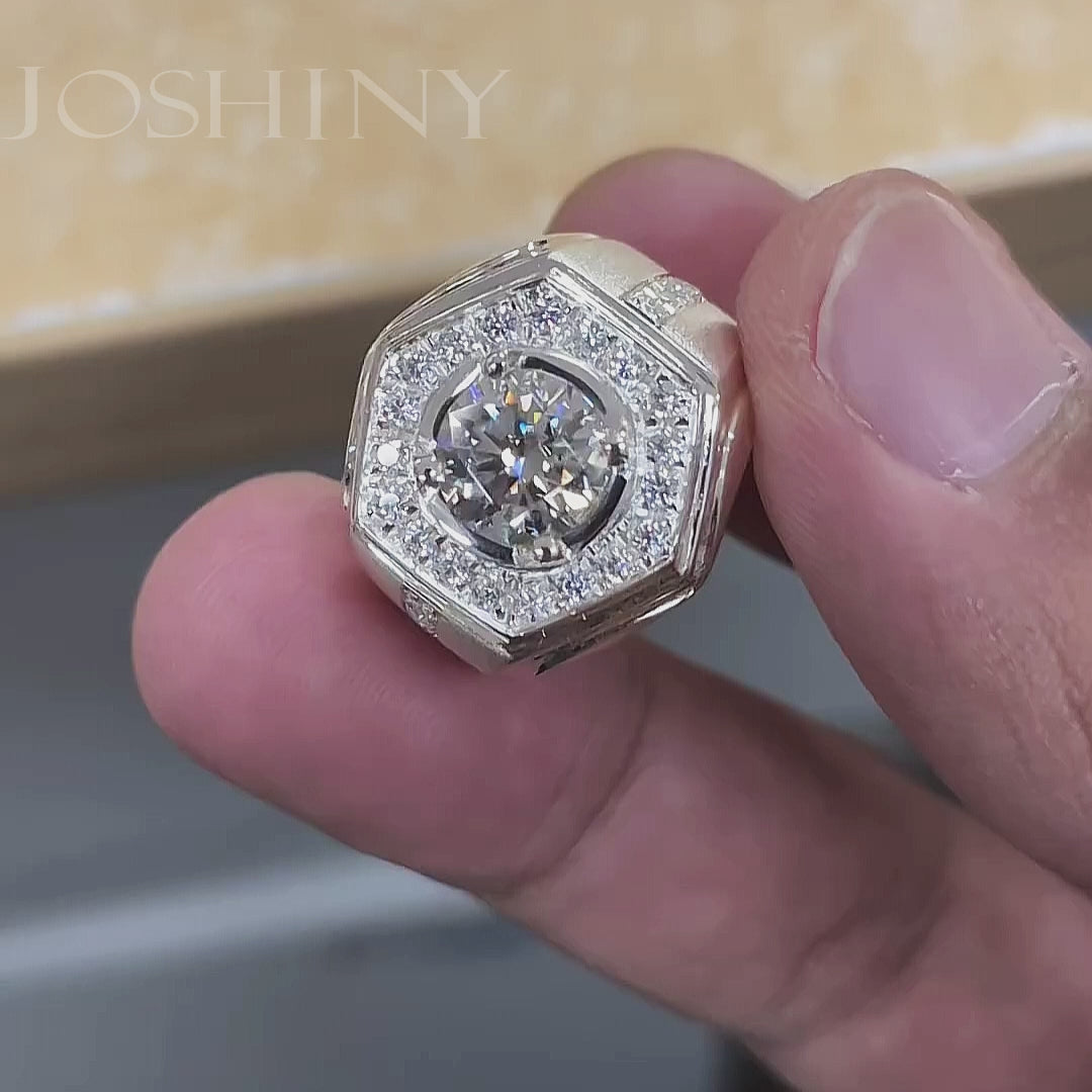 This is a ring with a simple design that has a sense of power. The center features a 3 carat round cut white master stone. Surrounded by round-cut white sub-stones. The polished and frosted wide band is unique and elegant. Total weight is approximately 5 carats. The ring is made of 925 silver throughout, with thick gold plating, which makes the luster last longer compared to other single layer plating. The style is personalized and simple, bringing more possibilities for your fashion collocation.