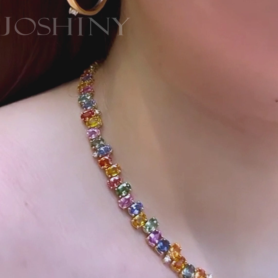 This is a multi-colored rainbow necklace. Round and Oval and Cushion cuts make this necklace sparkle. The necklace is made of 925 silver throughout, with thick gold plating, which makes the luster last longer compared to other single layer plating. The style is personalized and simple, bringing more possibilities for your fashion collocation.