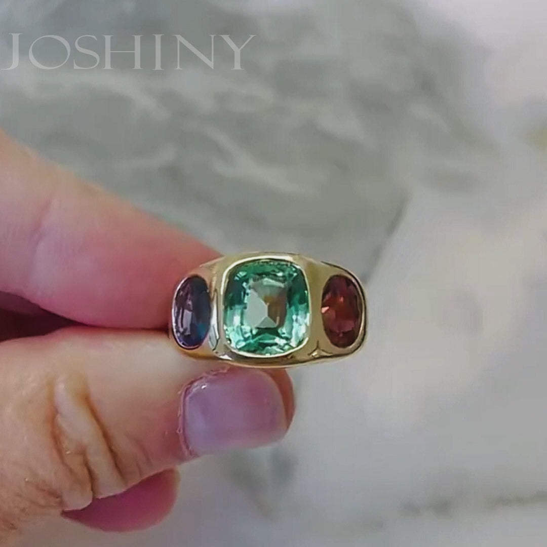 5ctw Cushion&Oval Cut Red&Green&Blue Vintage Three-Stone Gemstone Ring -JOSHINY