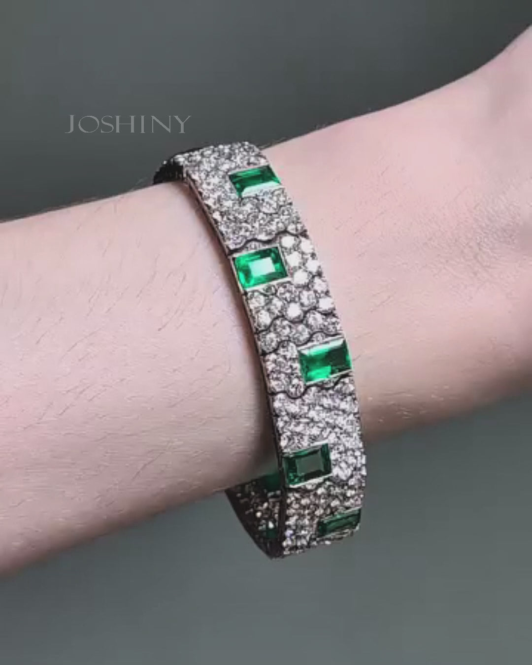 This exquisite emerald bracelet perfectly blends vintage charm with modern elegance. Sparkling gemstones surround a finely cut emerald, shimmering with captivating brilliance on the wrist and exuding luxurious sophistication. It's the ideal choice for important occasions or everyday adornment.